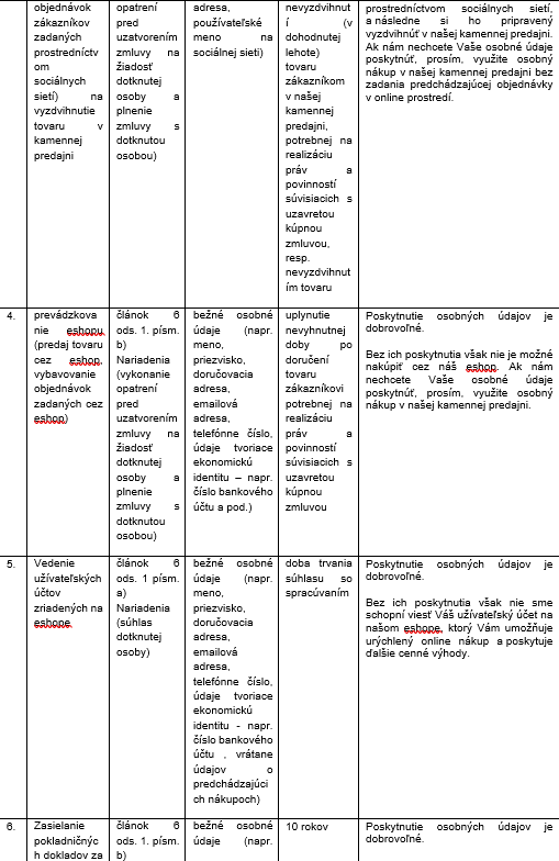 Vaše osobné údaje uchováme len na nevyhnutný čas potrebný na dosiahnutie účelu, na ktorý boli získané. V prípade vedenia užívateľských účtov na našom eshope, vedenia databázy uchádzačov o zamestnanie v našej spoločnosti a zverejňovania fotografií na našej webstránke, resp. profiloch na sociálnych sieťach, je doba uchovávania obmedzená dobou trvania Vášho súhlasu so spracúvaním. Ak spracúvame Vaše osobné údaje na základe nášho oprávneného záujmu, uchovávame ich, pokým neodpadne dôvod ich spracúvania alebo kým nenamietnete proti ich spracúvaniu. Musíme Vás však upozorniť, že aj keď odpadne niektorý z dôvodov spracúvania, nemusí to automaticky znamenať, že Vaše osobné údaje vymažeme. Tieto osobné údaje totiž môžeme a občas musíme spracúvať aj na iný účel (napr. na účel archivácie), ktorý je zlučiteľný s iným právnym základom.